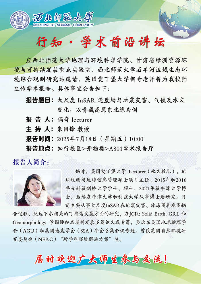 伟德BET官方网站行知•学术前沿讲坛2025-15期:大尺度 InSAR 速度场与地震灾害、气候及水文变化:以青藏高原东北缘为例